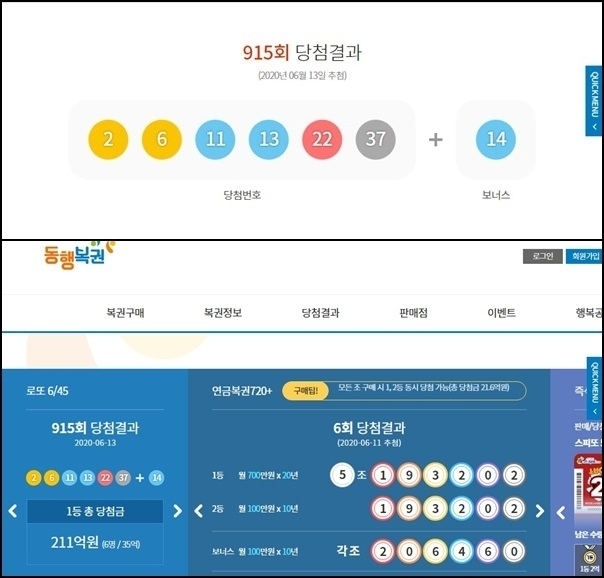 로또915회 당첨번호 추첨(조회) 결과 1등 6명 당첨금 35억1864만원씩