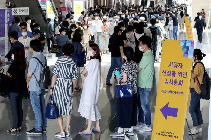 조합 측은 코론19 감염을 예방하기 위해 총회장 입구에서 모든 조합원들의 체온 등을 확인하고, 손 소독제와 비닐장갑 등을 비치했다. 입장을 위해 대기하는 장소에도 바닥에 노란색 테이프를 붙여 조합원 간 1m가량의 안전거리를 확보했다.