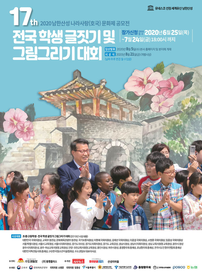 [시사뉴스 강민재 기자] 올해로 17회를 맞는 ‘2020 남한산성 나라사랑(호국) 문화제 - 전국 학생 글짓기 및 그림그리기 대회(이하 나라사랑 문화제)’이 신종 코로나 바이러스 감염증(코로나19)로 인해 공모전으로 진행된다.