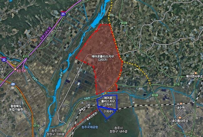 항공 관련 첨단·물류산업단지로 개발할 청주 에어로폴리스 3지구는 청주시 청원구 북이면 내둔·화상·화하리 일원 128만9718㎡에 조성된다. 사업 기간은 오는 2022년부터 2024년까지다.