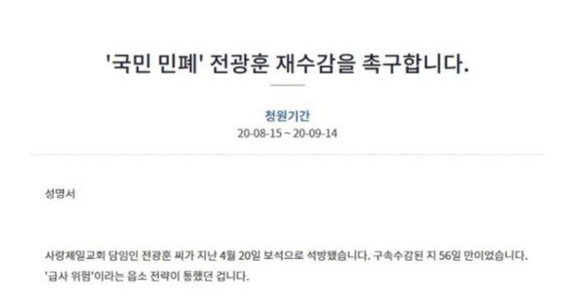 청원인은 전 목사가 이러한 법원의 허가 조건을 위배했으니, 보석허가를 취소하고 재구속 해야 한다는 주장이다. 해당 청원인은 "종교의 탈을 쓰고 우리 사회 안전을 해치는 전씨를 반드시 재수감 시켜 달라"며 "전광훈 구속이 방역의 새출발"이라고 목소리를 높였다.