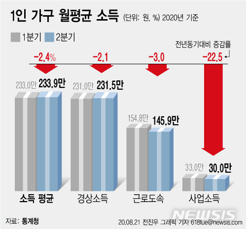 1인 가구 소득은 국내 코로나19 확진자가 본격적으로 확산되던 지난 1분기에도 4.8% 감소한 적이 있다. 당시 근로소득은 0.9% 증가했지만 사업소득이 11.2%나 감소한 탓이다.