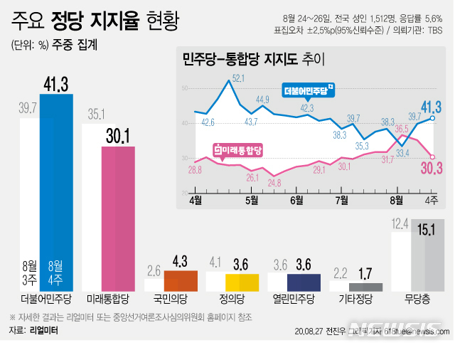 여론조사기관 리얼미터가 TBS 의뢰로 지난 27일 발표한 8월 4주차(24~26일) 주중 잠정 집계에 따르면 민주당 지지도는 지난주보다 1.6%포인트 오른 41.3%로 1위를 기록했다. 통합당 지지율은 지난주보다 4.8%내린 30.3%였다. 두 정당의 지지도 격차는 10.0%포인트로 다시 두 자릿수가 됐다.