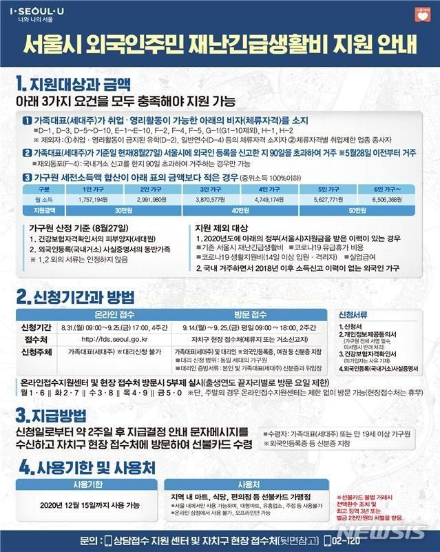 온라인 접수는 '서울시 외국인 주민 재난긴급생활비 지원' 홈페이지(http://fds.seoul.go.kr)에서 이달 31일부터 9월25일까지 신청할 수 있다. 홈페이지 신청은 24시간 가능하다.