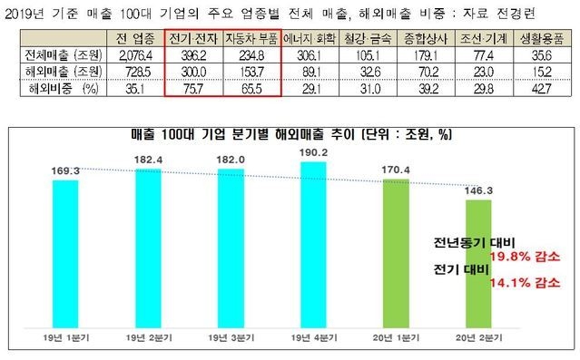 [시사뉴스 김성훈 기자] 전경련이 2019년 기준 매출액 상위 100대 기업의 연결기준 공시자료를 분석한 결과, 2020년 2분기 100대 기업 해외매출은 코로나19 팬데믹에 의한 사상 최악의 글로벌 경기 후퇴 영향으로 전년동기(2019년 2분기) 대비 19.8% 급감한 146.3조원을 기록한 것으로 나타났다. 금년 1분기의 경우, 코로나19에 의한 경제 영향이 중국, 아시아 지역에 한정되면서 전년동기(2019년 1분기) 대비 0.65% 증가한 170.4조원을 기록한 바 있다.