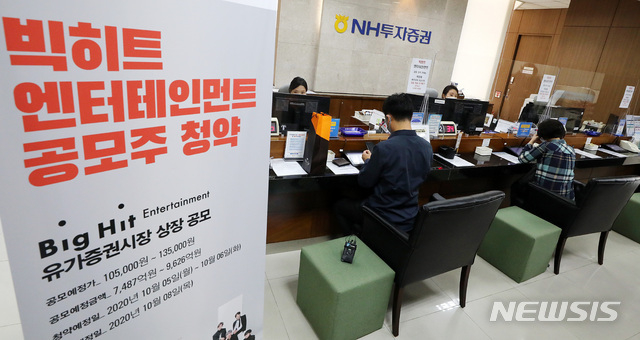 빅히트의 대표 상장 주관사인 NH투자증권에 따르면 청약 첫날인 전날 빅히트 공모주 청약 경쟁률은 4개 증권사 통합 89.6대 1을 기록했다. 청약 증거금은 총 8조6242억원이 걷혔다.