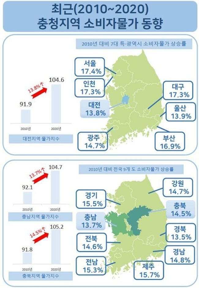 [시사뉴스 홍경의 기자] 충청지방통계청은 20일 지난해 충북지역 소비자물가지수는 105.2(2015년=100)로 2010년 보다 14.5% 상승했다고 20일 밝혔다.