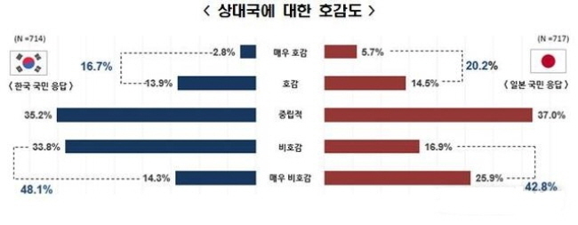 조사 결과에 따르면 상대국에 대한 호감도는 한·일 양국 모두 낮은 편이었다. 양국 국민은 상대국에 대해 '중립적'이라는 응답이 한국 35.2%, 일본 37.0%로 가장 많았지만 '비호감'이라는 응답이 '호감'이라는 응답보다 두 배 이상 많았다.