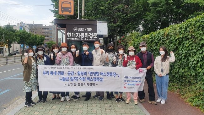 봉틀이 사랑방은 현대차 노사가 지원하는 '2021 안녕한 양정·염포 만들기' 공모사업에 선정돼 '우리 동네 위로·공감·힐링의 안녕한 버스정류장' 사업으로 이날 양정동에 있는 버스정류장 8곳에 의자 커버를 제작해 부착했다. 커버에는 감성 캘리를 활용한 명언이나 공익 문구도 넣었다.