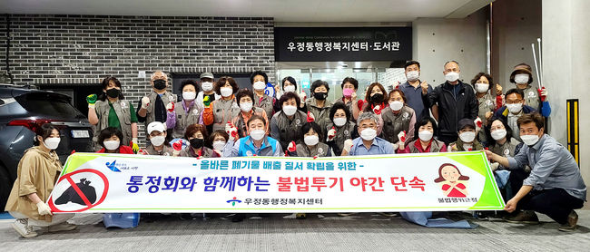 우정동 행정복지센터 이달부터 통정회와 함께 지역 내 생활 쓰레기 상습 무단 투기 지역 6개소를 중심으로 매월 1회 합동으로 야간단속을 실시한다.