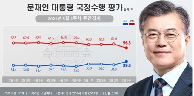 리얼미터는 YTN 의뢰로 실시한 5월 4주차(24일~28일) 주간 집계 결과, 문 대통령의 국정 수행 지지도가 전주보다 4.4%포인트 오른 39.3%(매우 잘함 21.3%, 잘하는 편 18.0%)를 기록했다고 30일 밝혔다.