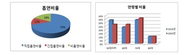연령대별 흡연자 비율은 70대에서 가장 높게 나타났으며 80대에서 가장 높은 47.8 갑년을 보였다. 젊은층인 50대 이하에서 흡연자 비율이 감소하였으나 고연령으로 갈수록 흡연자 비율이 증가하는 경향을 보였다.