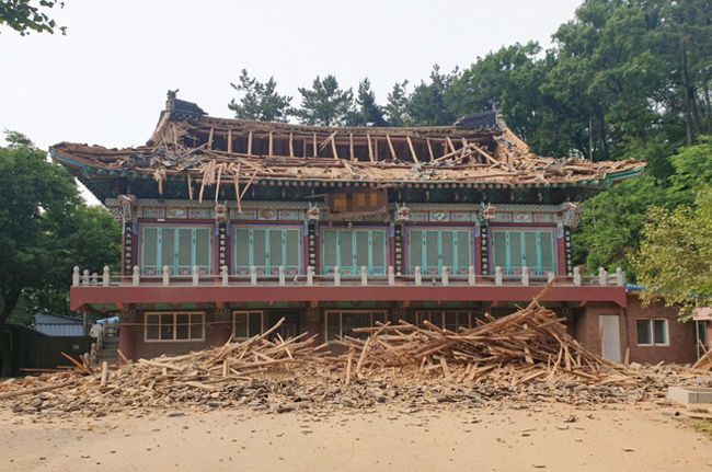 사찰 지붕이 무너져 내리면서 지붕의 부재와 기와 등이 바닥으로 떨어졌으나 다행히 인명피해는 발생하지 않았다.