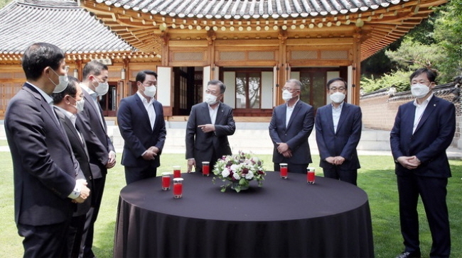 이날 간담회에는 최태원 대한상공회의소 회장 겸 SK그룹 회장, 정의선 현대자동차그룹 회장, 구광모 LG그룹 회장, 김기남 삼성전자 부회장이 초청됐다. 한미 정상회담 기간 총 44조원의 대미(對美) 투자를 통해 측면 지원한 것에 대한 격려를 위해 마련됐다.