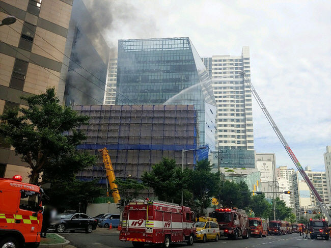 [시사뉴스 홍경의 기자] 4일 오전 8시 21분께 부산 동구의 한 건물 공사현장 옥상에서 냉각팬 구조물 해체작업 중 불이 났다.