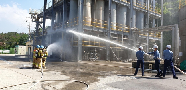 훈련은 위험물 제조소에서 화재가 발생, 연소확대되는 상황을 가정해 △관계인 상황 전파 및 인명대피 △포소화전 활용 초기 진압 △위험물 누출 차단 조치 △소방서 및 관계인 합동화재진압 순으로 진행됐다.