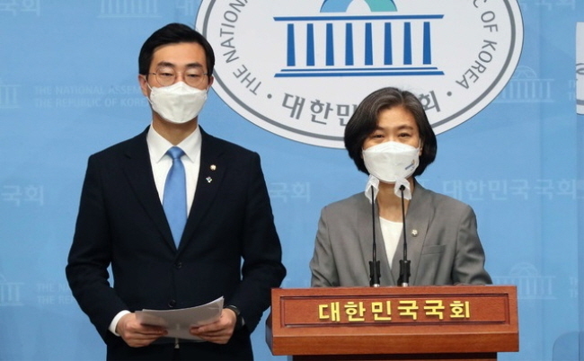 민주당 장경태, 열린민주당 강민정 의원은 이날 오전 국회 소통관에서 기자회견을 열고 전날 정당법·공직선거법·교육자치법 개정안을 공동발의했다고 밝혔다.