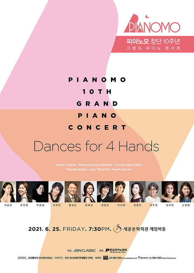 전문 피아니스트들로 구성된 연주 단체 피아노모는 지난 2010년 창단 이후 매년 연주회를 열어 올해로 10주년을 맞이한다. 애런 코플란드(Aaron Copland, 1900-1990)의 멕시코 하리스코 춤곡(Danza de Jalisco)과 쿠바 춤곡(Danzon Cubano)을 피아니스트 차승안, 오민정이 두 대의 피아노로 듀엣 연주한다. 리차드 로드니 베네트(Richard Rodney Bennett, 1936-2012)의 네 개의 모음곡(Four Pieces)은 박혜성, 서규인이 호흡을 맞춘다.