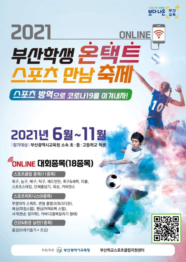 [시사뉴스 정윤철 기자] 부산광역시교육청(교육감 김석준)은 8일부터 오는 11월 30일까지 부산지역 모든 초·중·고등학교를 대상으로 ‘2021 부산학생 온택트 스포츠 만남 축제’를 개최한다.