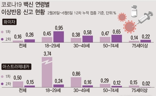 백신 종류별 신고율은 아스트라제네카 백신 0.46%, 화이자 백신 0.2%였다.