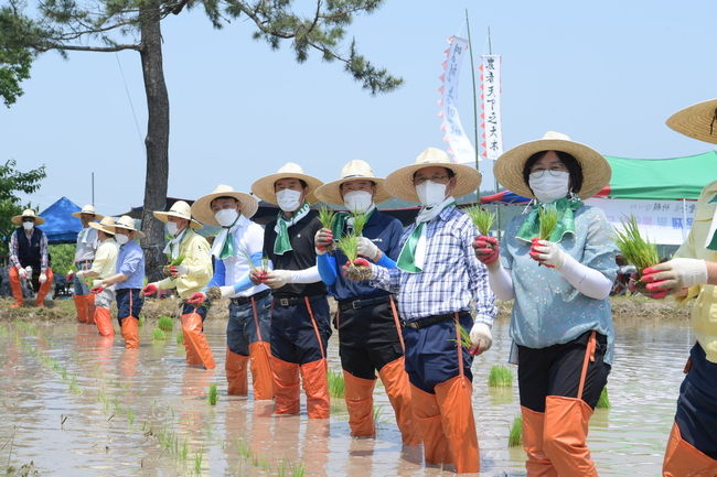 이어, 참석한 내빈들은 현장에 준비된 장화를 신고 통일경작지에서 남북교류 확대와 평화통일을 염원하는 마음을 담아 전통방식으로 손 모내기를 시연하는 뜻깊은 행사를 가졌다.