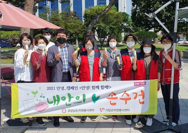 [시사뉴스 정윤철 기자] 거창군은 9일 군청 앞 문화휴식공간에서 거창군 자원봉사센터와 업사이클 재능나눔봉사단, 일반봉사자 등 10여 명이 참여해 2021년 경남안녕캠페인 탄소중립프로그램인 ‘내안의 손수건 활동’을 주제로 캠페인 활동을 진행했다.