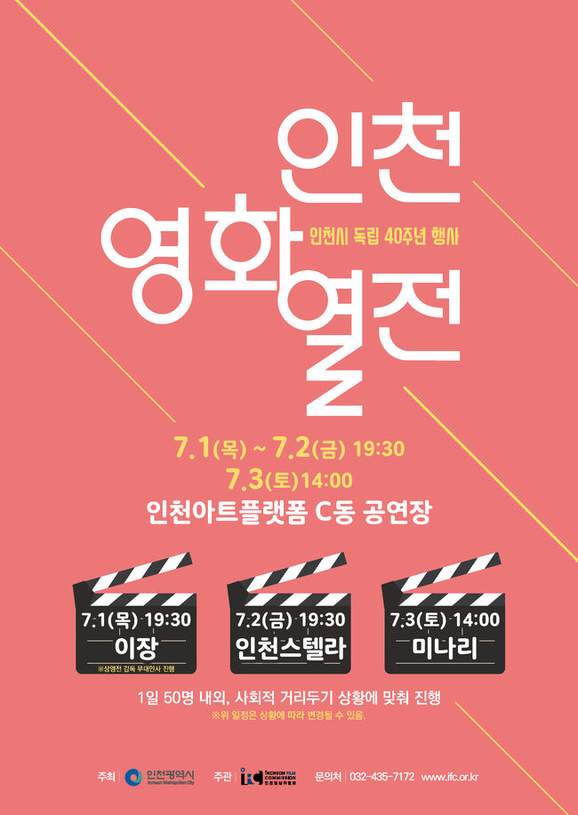 7월 1일(목)부터 3일(토)까지 3일간 열리는 이번 행사는 인천아트플랫폼 C동 상영관에서 1일 1편씩 상영한다. 영화는 7월 1일(목)에 인천 출신 감독인 정승오 감독의 따뜻한 시선으로 풀어낸 오남매 이야기 <이장>이, 백승기 감독 특유의 재치를 담은 <인천스텔라>가 7월 2일(금)에, 해외 주요 시상식에서 112관왕을 차지한 정이삭 감독의 <미나리>가 7월 3일(토)에 상영될 예정이다.