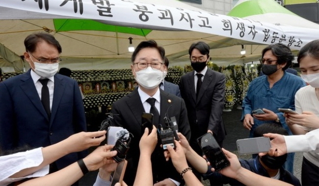 [시사뉴스 홍경의 기자] 박범계 법무부 장관이 11일 광주 재개발 건물 붕괴 참사와 관련한 불법 하도급 의혹에 대해 법과 원칙에 따른 철저·신속한 수사가 필요하다고 밝혔다.