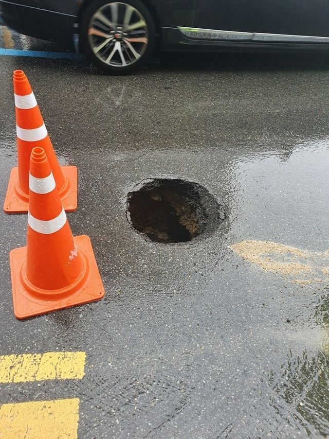 [시사뉴스 김도영 기자] 부산 수영구의 한 도로에서 지름 30cm 크기의 싱크홀이 발생해 도로 정체가 빚어지고 있다.
