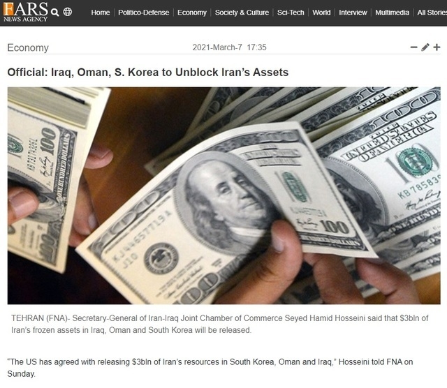 통신은 "이란 외무장관은 유엔 사무총장에게 항의 서한을 보내 이란 국민에 대한 억압적인 제재와 미국의 경제 테러 문제를 지적했다"며 "마침내 외교적 노력으로 차단된 이란 돈이 한국에서 풀려나 유엔 계좌로 이체됐다"고 밝혔다.