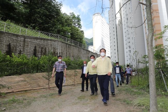 [시사뉴스 정윤철 기자] 허성무 창원시장은 16일 진해구 자은3지구 에일린의 뜰 아파트 뒤 경관녹지 보완사업 및 아파트 단지 내 피해 복구공사 현장을 점검했다.