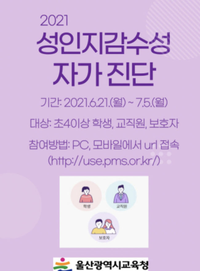[시사뉴스 정윤철 기자] 울산광역시교육청(교육감 노옥희)은 성희롱 예방과 성평등 문화 조성을 위해 초등학교 4학년부터 고등학생, 교직원, 보호자 대상으로 ‘성인지 감수성 자가 진단’을 실시한다고 22일 밝혔다.