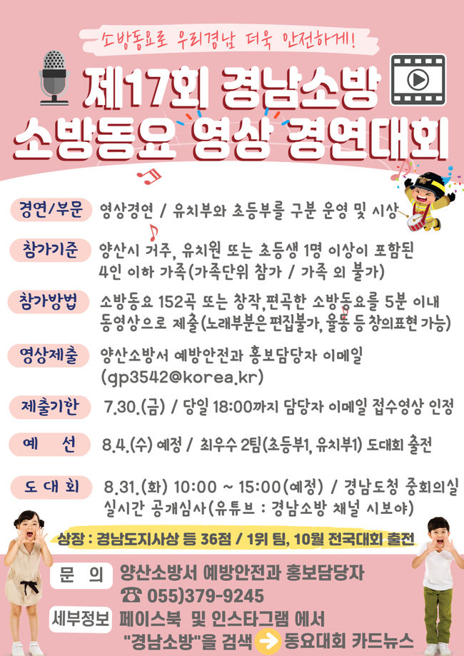 [시사뉴스 정윤철 기자] 양산소방서(서장 박정미)는 오는 8월 개최될 제17회 경상남도 119소방동요 영상 경연대회 참가자를 모집한다고 22일 밝혔다.