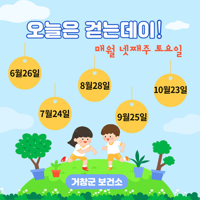 [시사뉴스 정윤철 기자] 거창군은 코로나19 장기화로 제한된 일상 속에 혼자서도 실천 가능한 걷기 운동을 독려하기 위해 매월 넷째 주 토요일을 ‘걷는 데이(day)’로 지정해 캠페인을 운영한다.