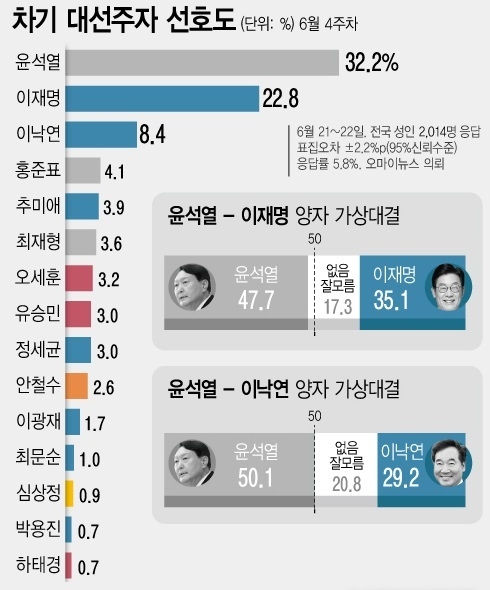 24일 여론조사 전문기관 리얼미터(대표 이택수)가 '오마이뉴스' 의뢰로 여야 주요 정치인 15인을 대상으로 한 6월 4주차 차기대선주자 선호도 조사를 실시한 결과, 윤 전 총장은 지난 조사(6월 2주차) 대비 2.8% 포인트 하락한 32.3%를 기록했다.