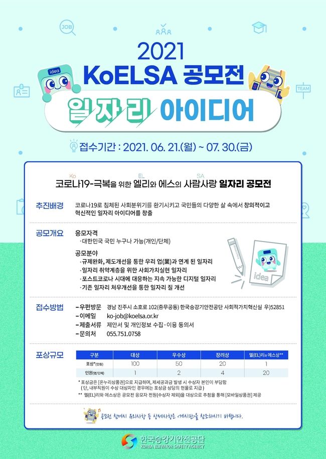 [시사뉴스 정윤철 기자] 한국승강기안전공단(이하 공단)이 참신한 일자리 아이디어 발굴을 위해 ‘2021년 KoELSA 일자리 아이디어 공모전’을 7월 30일까지 개최한다고 지난 22일 밝혔다.