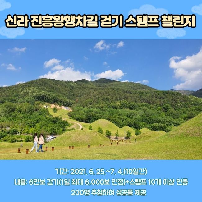 참여를 원하는 군민은 모바일 걷기 앱 워크온에 가입하면 챌린지에 참여할 수 있으며 기간 중 목표걸음 6만보 걷기와 진흥왕행차길 코스 13개 장소 중 10개 이상의 스탬프를 인증한 200명을 추첨해 신체활동 용품을 제공할 예정이다. 기타 자세한 사항은 창녕군 보건소 건강증진팀으로 문의하면 된다.