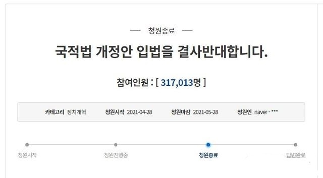 그러나 청원인은 "국적법 개정을 통해 저출산과 고령화를 해결한다는 것은 터무니없는 사고에 불과하다"며 특히 "영주권 주 대상인 화교들 포함 많은 외국인들이 사회에서 얼마나 많은 권리를 갖는지 안다"고 비판했다. 해당 청원에는 한달 간 총 31만7013명이 동의했다.