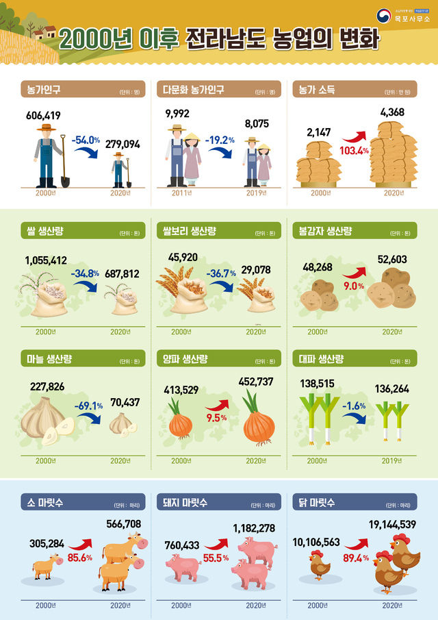 [시사뉴스 홍경의 기자] 2020년을 기준으로 지난 20년 간 전남지역 농가 수와 농업인구가 각각 전국 평균보다 크게 줄어든 것으로 나타났다.