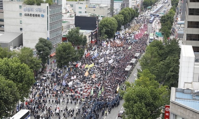오후 1시를 넘기며 속속 종로3가로 모여든 조합원들은 1시50분께부터 차도를 점거하며 행진을 시작했다. 수천여명의 조합원들 중 마스크를 착용하지 않은 사람은 목격되지 않았지만, 이들 간 간격은 1~2m도 되지 않으며 거리두기가 지켜지지 않는 모습이었다.