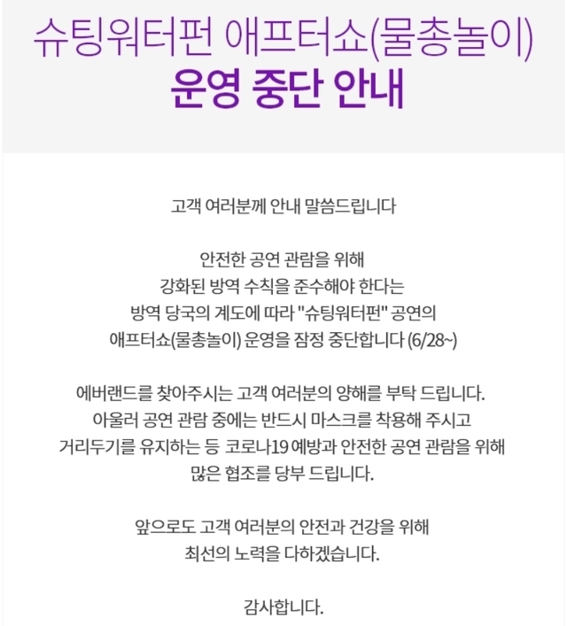 문체부는 지자체와 합동으로 물놀이 유원시설 216개소에 대해 이달 30일까지 방역실태 전수점검을 한다. 물놀이 외의 유원시설 500개소 안팎에 대해서도 8월 말까지 현장점검을 추진할 계획이다.