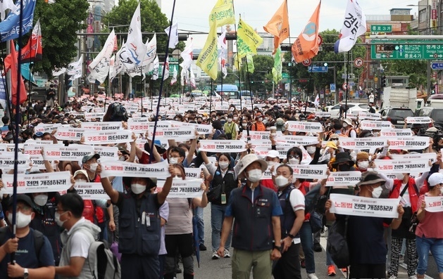 이들은 주최 측 추산으로 약 8000여명이 참석해 2시간 동안 '비정규직 철폐하라', '구조조정 중단하라', '최저임금 인상하라' 등 구호를 외치며 행진을 이어갔다.