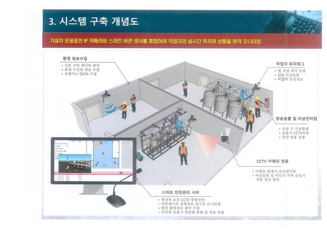 이 시스템은 작업자에게 비콘(위치정보 발생장치)을 달아 사업장 내 모든 작업자의 위치와 위험상황(쓰러짐, 추락 등)을 실시간 모니터링 할 수 있다.
