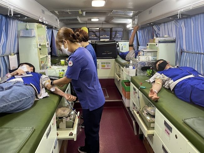 공장에 마련된 이동식 헌혈 버스에서 헌혈에 참여한 임직원들은 마스크 착용, 체온 측정과 손 소독 등 감염병 예방 수칙을 지키며 헌혈 캠페인에 참여했다.