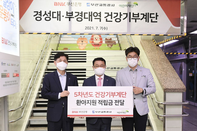 [시사뉴스 정윤철 기자] BNK부산은행은 7일 오후, 부산지하철 2호선 경성대·부경대역 승강장에서 ‘BNK건강기부계단’ 적립금 2000만원을 초록우산어린이재단 부산지역본부에 전달했다.