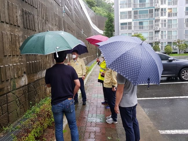 현장을 찾은 박환기 부시장은 공동주택 옹벽 및 사면을 직접 점검하는 한편 공동주택 관리주체와 입주자 대표에게 “장마기간 동안 지속적인 현장 확인을 통해 위험이 높은 시설물에 대해 철저히 관리하고, 인명이나 재산피해가 발생하지 않도록 최선을 다해주기 바란다”고 당부했다.