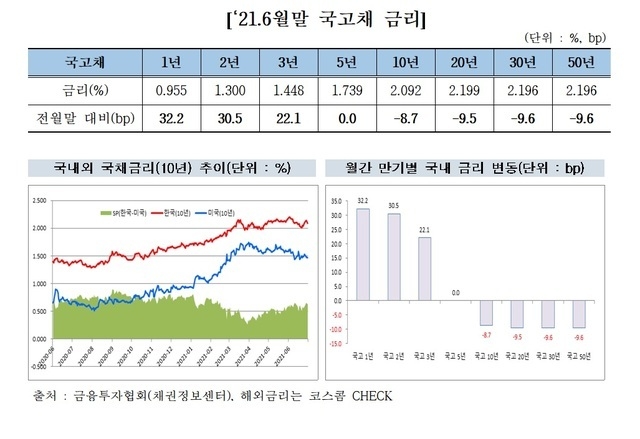 8일 금융투자협회가 발표한 '2021년 6월 장외채권시장 동향'에 따르면 이달 말 3년 국고채 금리는 1.448%로 전월 말 대비 22.1bp올랐다. 반면 10년 국고채 금리는 2.092%로 8.7% 하락했다.