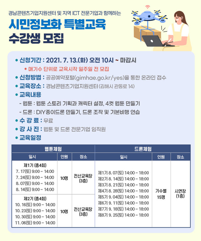 [시사뉴스 정윤철 기자] 김해시는 시민들을 대상으로 관심과 흥미가 높으나 평소 접하기 어려운 첨단 디지털 교육 기회를 부여하고자 웹툰 및 드론체험 특별교육을 실시한다.