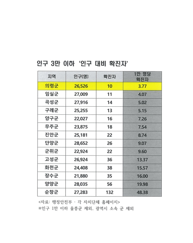 이처럼 의령군이 ‘인구 대비 확진자 수’가 경남에서 제일 적고, 전국 3만 이하 지역에서도 최소 확진자 수를 기록하자 지역사회에 관심이 집중되고 있다.