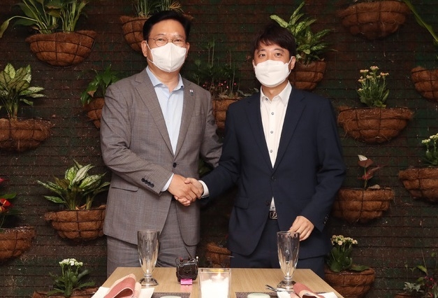 양당 대표는 앞서 여의도에 위치한 한식당에서 만찬 회동을 가졌다. 코로나19 4차 유행으로 지난 7일 갖기로 했던 '치맥 회동'이 무산된 후 어렵사리 성사된 것으로, 수도권 사회적 거리두기 4단계 격상에 맞춰 배석자 없이 단독 회동을 가졌다.
